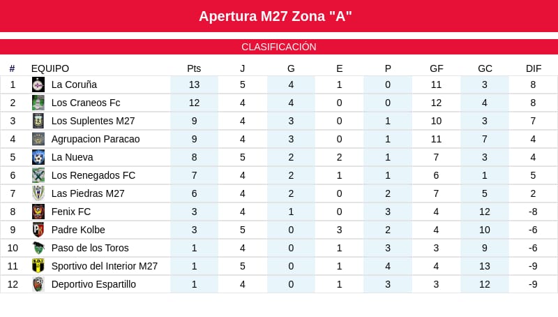 En la Zona A manda La Coruña con 13 unidades y viene de golear 4-1 a Sportivo del Interior. Este sábado expondrá el liderazgo ante Las Piedras.