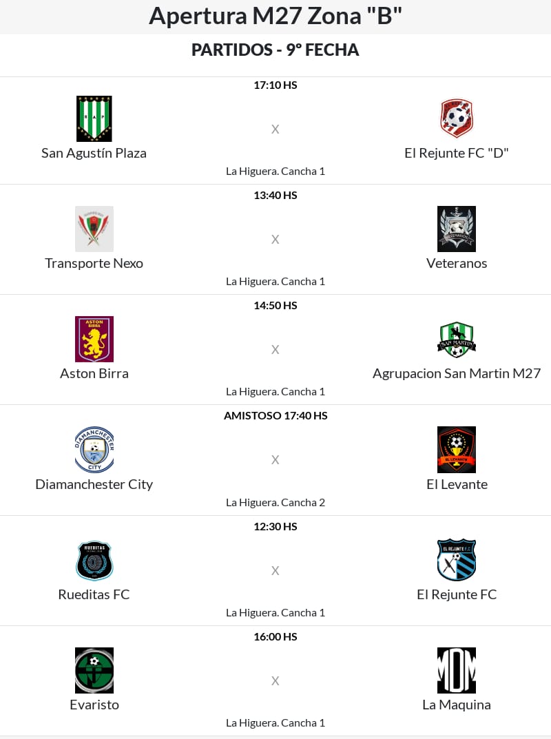 El otro líder San Agustín Plaza jugará ante el Rejunte FC de Diamante desde las 17:10 también en Cancha 1.