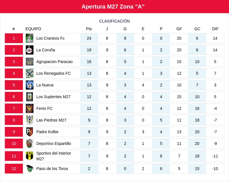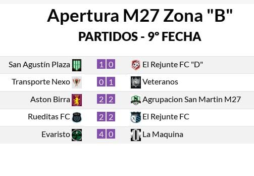 Pasó la Novena Fecha en Liga Río Paraná, que dejó lideres solitarios en todas las competencias del Apertura, al sumarse San Agustina Plaza en la Zona B de la Categoría M 27 a quienes ya lo venían siendo como Los Cráneos FC en la Zona A y Los Suplentes en la Categoría M 40.