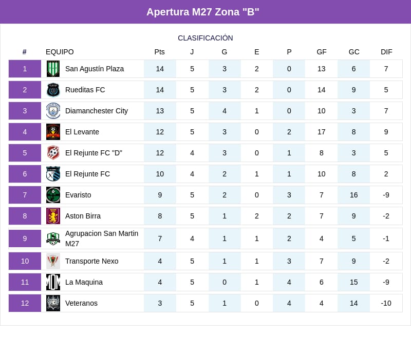 Los lideres de la Zona con 14 puntos son San Agustín Plaza y Rueditas FC, el primero enfrentara a Aston Birra y Rueditas lo hará ante El Rejunte FC de Diamante. Ambos encuentros se disputarán en la Cancha 2.