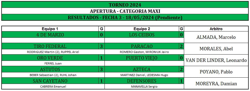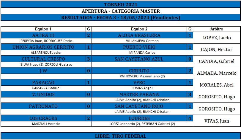 Paracao venció a Tiro Federal Azul por 3 a 2, Universitario 1 a 0 a Alegría, el CUAC 4 a 2 a CAATSA y Agrupación Cerrito 3 a 1 a Bajada Grande.