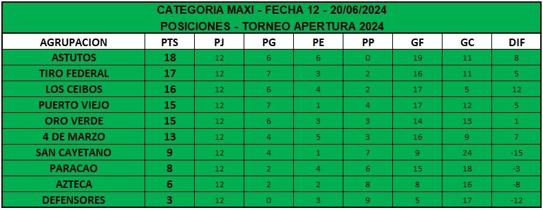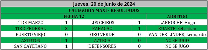 La categoría Maxi tuvo el desarrollo de la fecha 12 para el Apertura; torneo que mantiene un sólo líder.