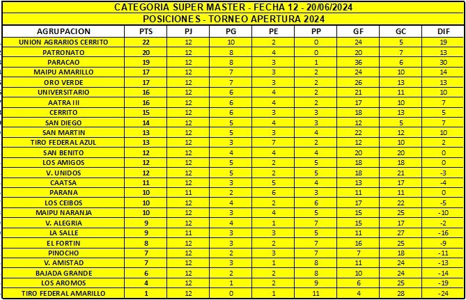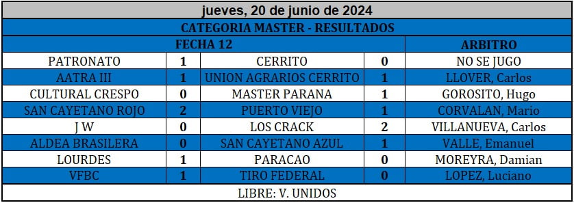 El Apertura en Liga de Veteranos disputó el capítulo 12. Astutos es el líder en Maxi, Paraná sigue arriba en Master y en Súper Master, Unión Agrarios Cerrito.