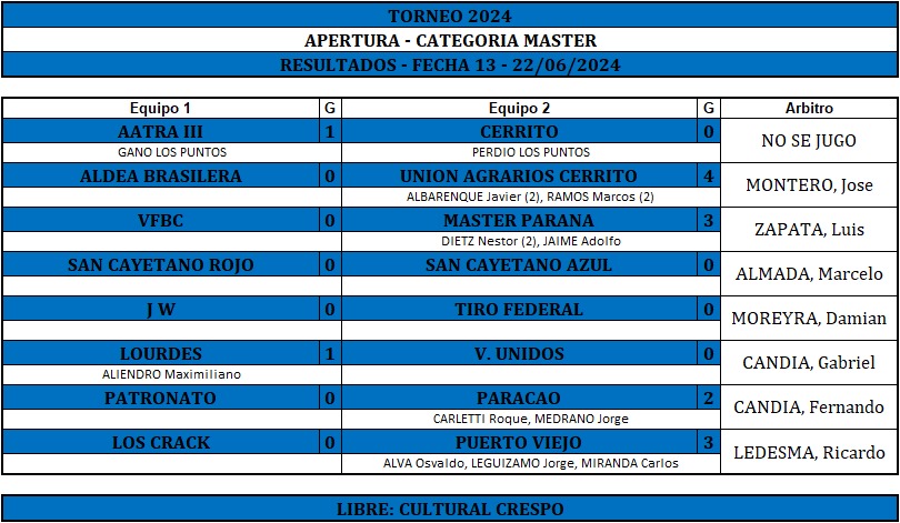 Todo sigue igual en los tres primeros puestos, con Master Paraná como único líder con 22 puntos, Lourdes escolta con 21 y Unión Agrarios Cerrito con 19. Master Paraná venció a Viale FBC por 3 a 0 con dos goles de Néstor Dietz el restante de Adolfo «Mancuso» Jaime. En cuanto al escolta, venció por 1 a 0 a Veteranos unidos con gol de Maximiliano Aliendro. Por su parte Unión Agrarios Cerrito, el tercer candidato a quedarse con el Apertura y que se ubica a tres puntos del líder, goleó 4 a 0 a Aldea Brasilera