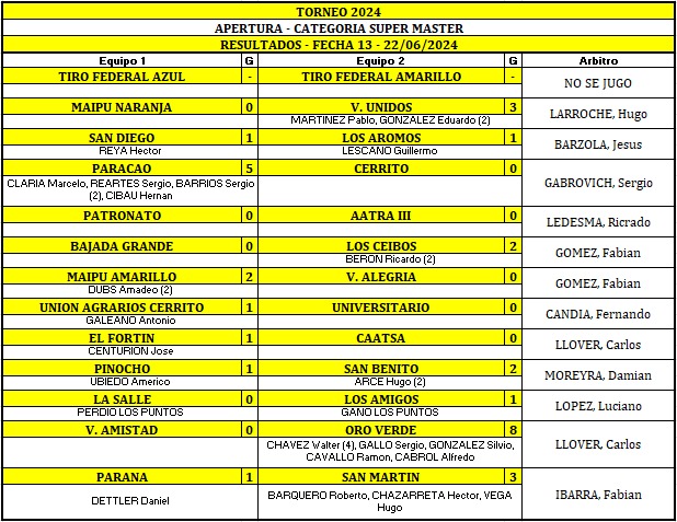 Sin cambios de líderes, paso la Fecha 13 en Liga de Veteranos. Para destacar, la goleada por 8 a 0 de Oro Verde sobre Amistad en Súper Master. Fotos y videos: La Fiesta del Fútbol www.lafiestadelfutbol.com.ar,… donde queda tu historia. Seguinos en Facebook: La Fiesta del Fútbol – Instagram: @lafiestadelfutbol – Twitter: LFdelFutbol – Canal de Youtube: LAFIESTADELFUTBOLTV . BAJÁ NUESTRA APP a tu celular (Encontrarás todo en un mismo lugar)