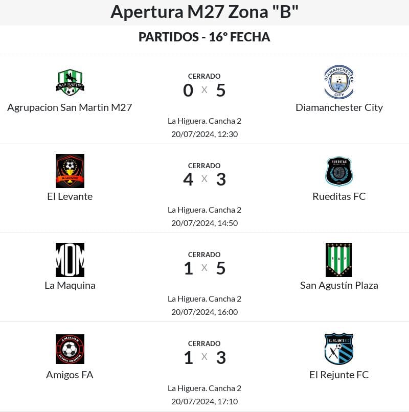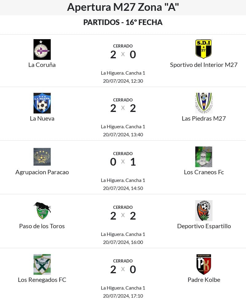 En cuanto a la M 27, el líder Los Cráneos FC sigue ganando, aunque esta vez en forma mu apretada ante Agrupación Paracao a quien venció por 1 a 0