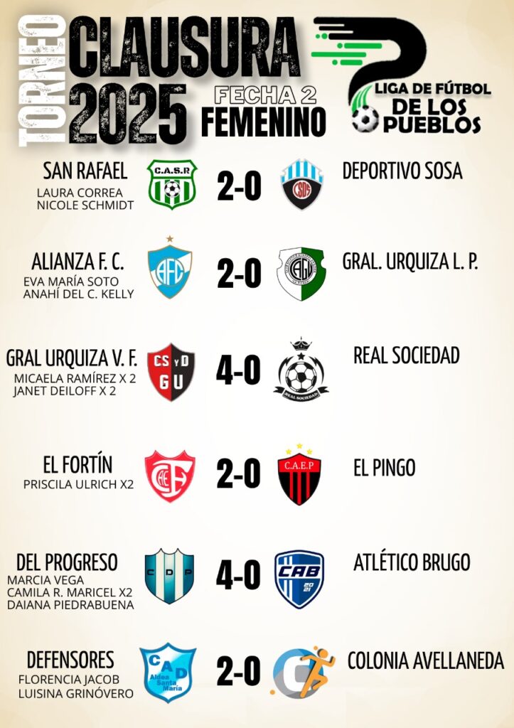 El Rojo de Etchevehere venció 2-0 a El Pingo; Las ramirenses, 2-0 a Gral, Urquiza de La Picada; las chicas de Villa Fontana, 4-0 a Real Sociedad y las Albiverdes de La Aldea, 2-0 a Dep. Sosa.