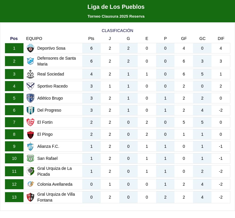 La tabla de posiciones de la categoría Reserva en Liga de los Pueblos, muestra en dos fechas a dos punteros.