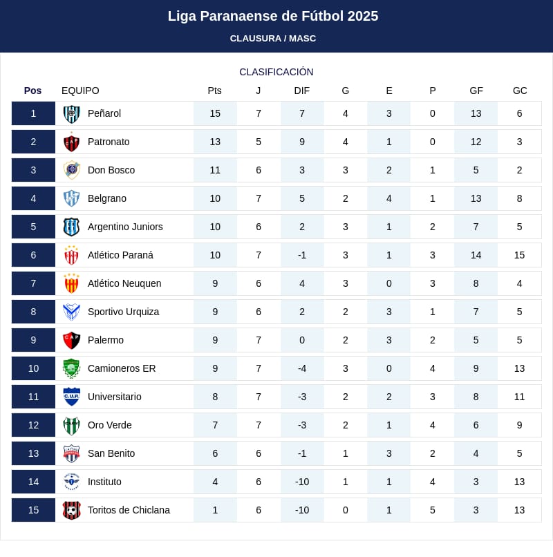 De esta manera, Peñarol quedó con 15 unidades; y tiene dos puntos de ventaja sobre Patronato, que buscará ser único puntero.