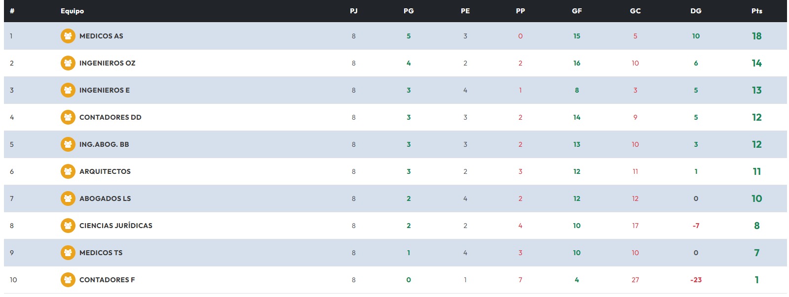 Respecto a Contadores V, enfrentará a Abogados E. Los V golearon la fecha pasada a Contadores E 4 a 0.