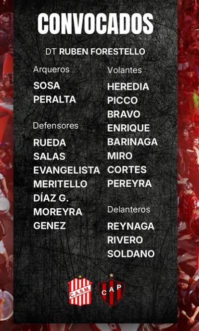 PATRONATO: Alan Sosa; Maximiliano Rueda, Gabriel Diaz, Franco Meritello, Fernando Moreyra y Facundo Heredia; Federico Bravo, Juan Barinaga y Brandon Cortes; Valentin Pereyra y Hernan Rivero. DT: Ruben Forestello.