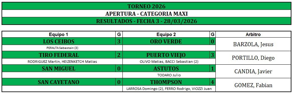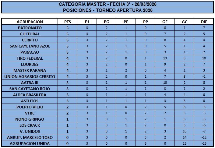 Patronato venció 6 a 1 a Veteranos Unidos, AATRA III vapuleó 9 a 0 a Agrupación Unida, equipo nuevo en Liga de Veteranos y Tiro Federal le hizo 7 a Agrupación Marcelo Toso+, el otro equipo recién llegado este año al Complejo Oscar Chapino