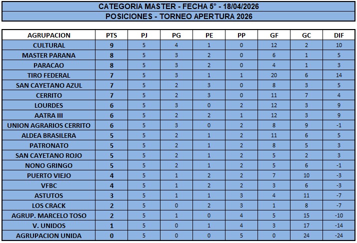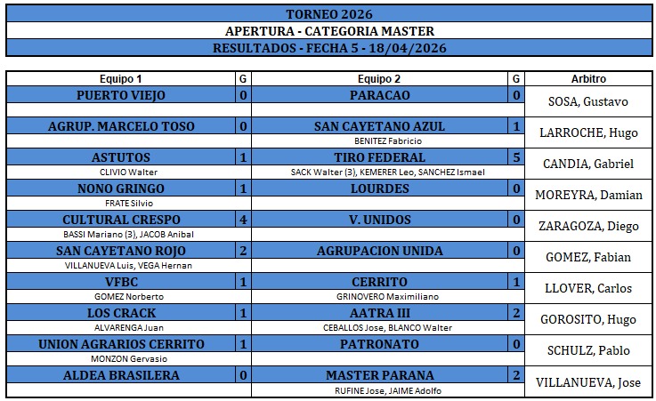 En Liga de Veteranos se disputó el sábado pasado, la Quinta fecha del Apertura Juan Jumilla, con cuatro canchas programadas en el Predio de la Liga Paranaense y tres en el Complejo Chapino.