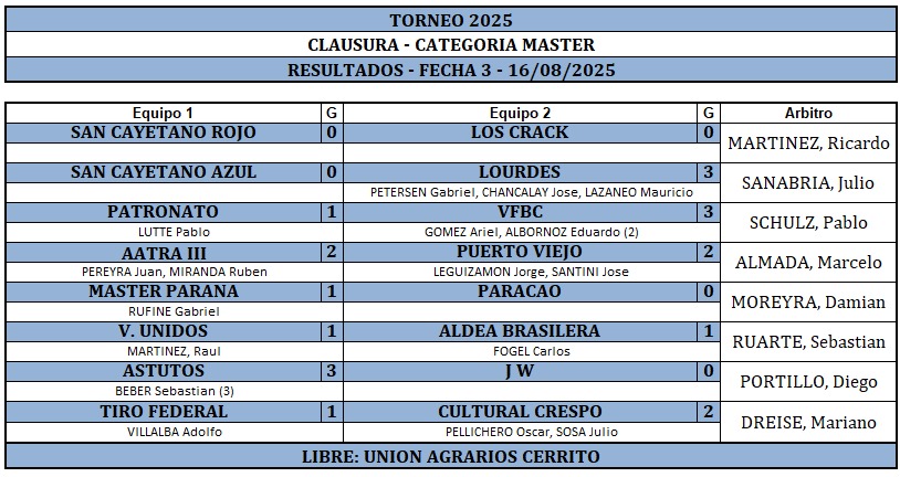 Transcurridas tres fechas siguen mandando en la tabla Cultural de Crespo y Master Paraná, quienes han obtenido tantos triunfos como presentaciones en el Clausura.
