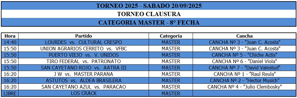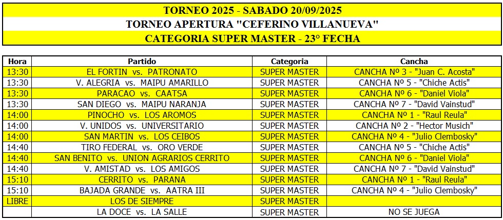 Habrá más fútbol en Liga de Veteranos con la disputa de la Fecha 23 del Apertura en la Súper Master, la Septima del Clausura en Master y la Ocatva en la Categoría Maxi.