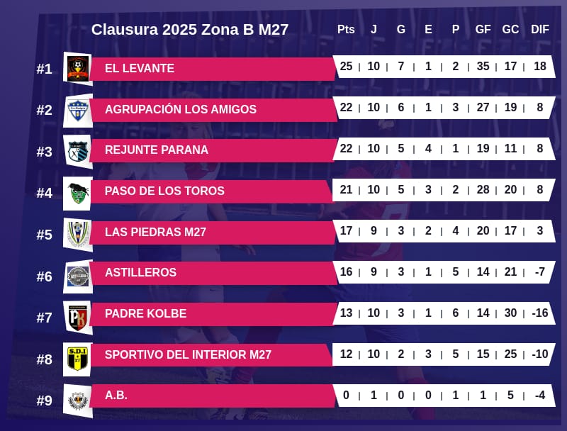 Todo sigue igual con El Levante puntero con 25 puntos, seguido por Agrupación Los Amigos y El Rejunte Paraná con 22.
