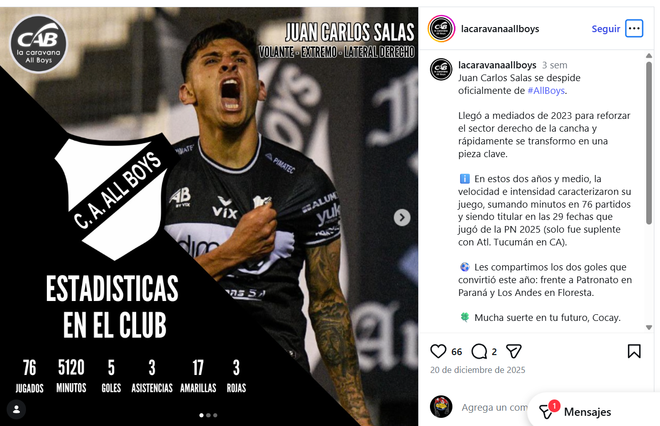 Precisamente esas buenas actuaciones llevaron al presidente Bruffal, al DT Forestello y al Mánager Víctor Muller a enfocarse en Salas.